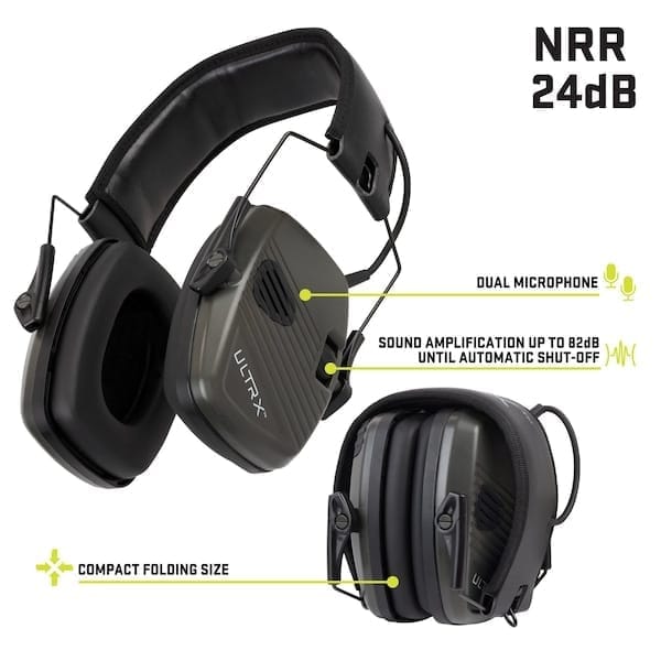 The ULTRX Stereo Electronic Earmuff is your ultimate companion for hearing protection and enhanced audio experiences. Engineered with a Noise Reduction Rating NRR of 24dB, this earmuff meets the ANSI S3.19 standard, providing top-notch noise reduction. The built-in stereo microphones help amplify ambient sounds, ensuring clear communication in noisy environments. Features an automatic shut-off mechanism at 82dB, safeguarding your hearing to its upmost potential. Powered by 2 AAA batteries, its compact foldable design makes portability a breeze. Elevate your hearing protection game with the ULTRX Stereo Electronic Earmuff, where safety meets superior audio.